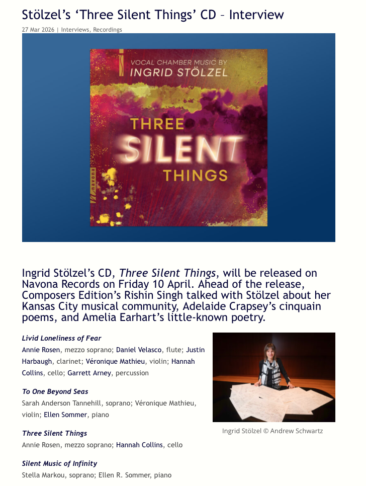 Ingrid Stölzel’s album, Three Silent Things, will be released on Navona Records on Friday 10 April. Ahead of the release, Composers Edition’s Rishin Singh talked with Stölzel about her Kansas City musical community, Adelaide Crapsey’s cinquain poems, and Amelia Earhart’s little-known poetry.